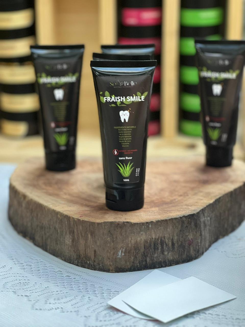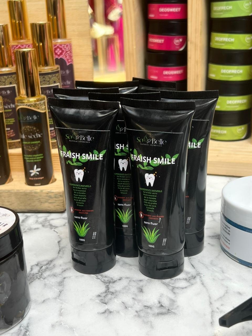 Fraîche Smile est un dentifrice naturel formulé à base de charbon actif, reconnu pour ses propriétés purifiantes et blanchissantes. Il aide à nettoyer les dents en profondeur, éliminer les impuretés et contribuer à un sourire plus blanc et éclatant.